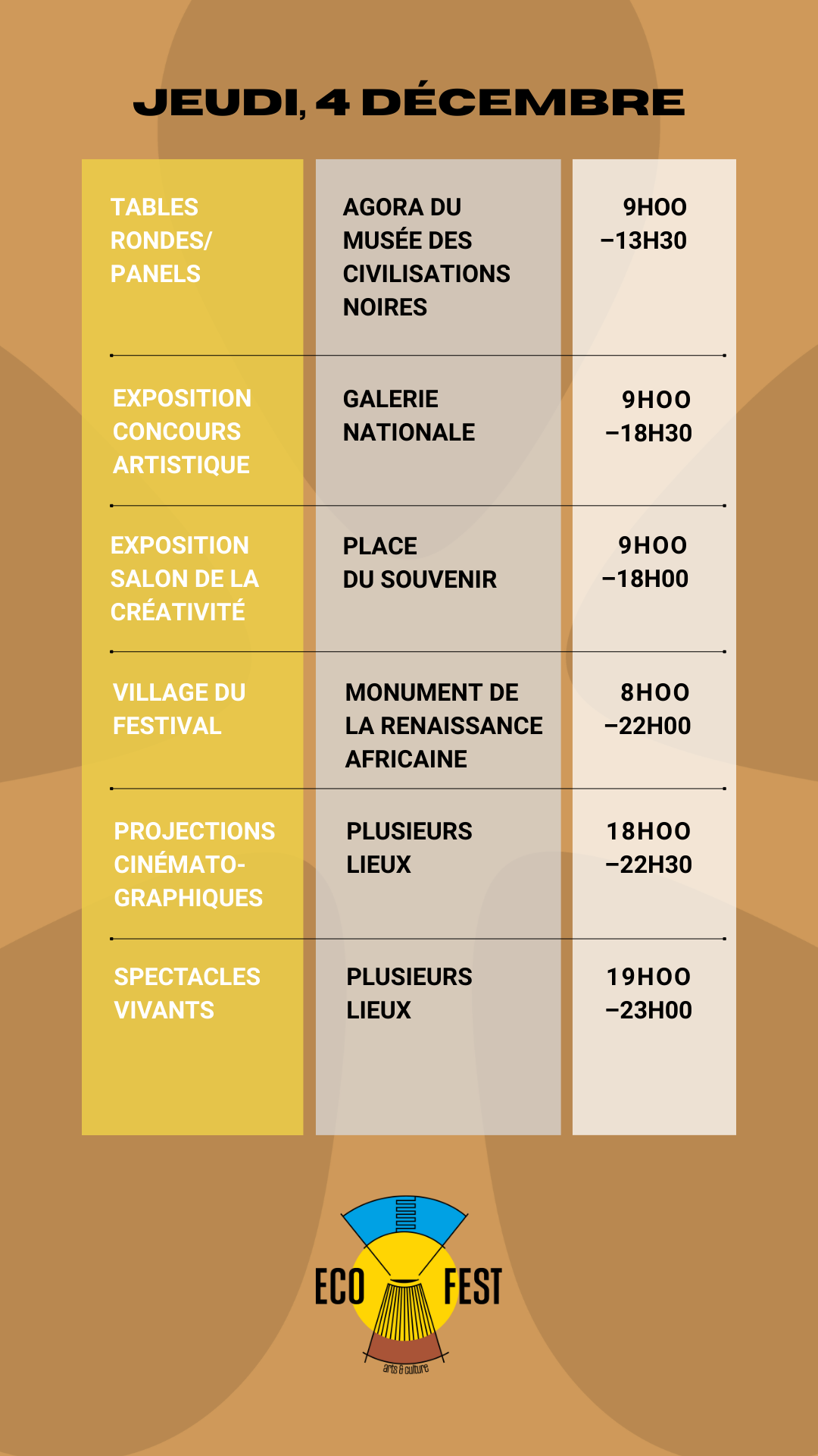 ECOFEST démarre par une grande cérémonie d'ouverture, suivie de 6 jours de manifestations culturelles et artistiques, de rencontres professionnelles et de performances artistiques, d’exposition d’art, pour aboutir à une cérémonie de clôture célébrant le riche patrimoine de la région ouest africaine.